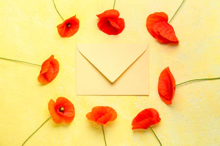 Beautiful red poppy flowers with envelope on color background