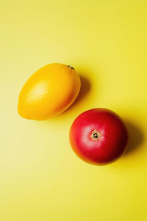 Mango and tomato on a yellow background. Minimal style.