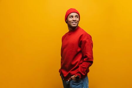 Portrait of an attractive smiling confident casual young african man standing over yellow background, looking away