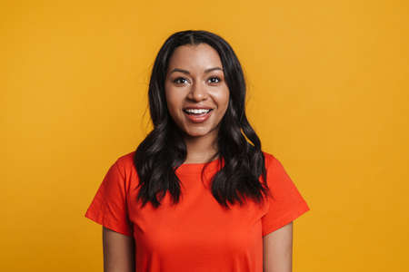 Young black happy woman smiling and looking at camera isolated over yellow background