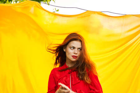 pretty woman in red dress gesturing with her hands nature yellow background