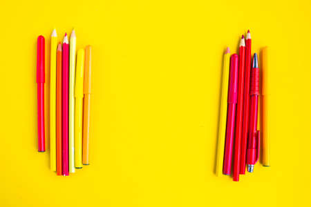 Color red and yellow pencils on bright yellow background, top view, copy space