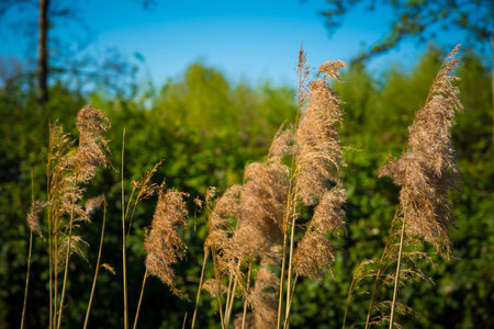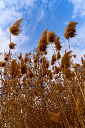 Dry cane reed rush golden heads with bright blue sky as background on sunny spring day