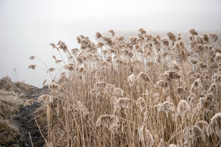Reed along the misty edge of a lake in wetland in bright foggy sunlight in winter, Almere, Flevoland, The Netherlands