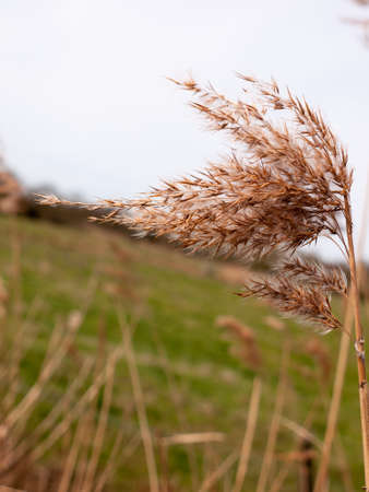 Common Reed (Phragmites australis) close to a lake in sunny autumn light against the blue sky