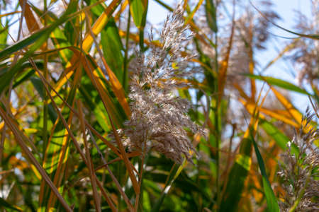 Common reed Phragmites australis. Thickets of fluffy dry trunks of common reed against the background of lake water. Up close Nature concept for design.