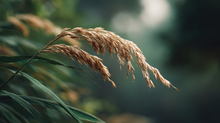 A detailed photograph of a single Teff, swaying gently in the wind, captured in natural daylight. Fresh and airy atmosphere, soft motion blur on leaves, crisp details on textures, background softly blurred into natural greenery, cinematic natural light, realistic photography style.