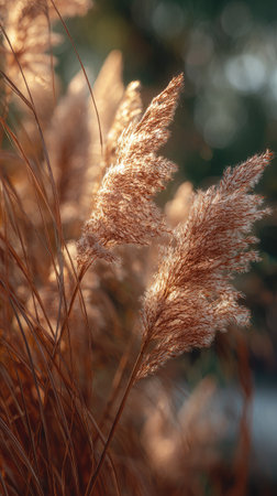 Delicate plumes of pampas grass sway gently in the breeze, creating a serene and peaceful scene.