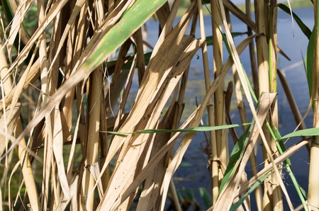 Dry reeds in morning hours. Close up. Outdoors. Sunrise