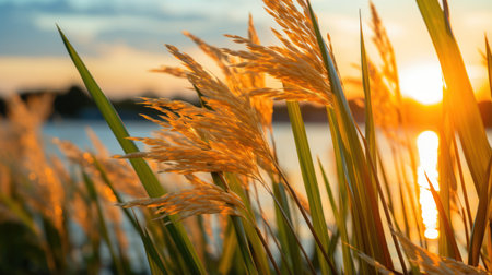 Beautiful sunset landscape scene, reed in sunlight, blurred background with reflection in the river. Beauty sunny backdrop, trees in a forest. Tranquil nature in sunlight