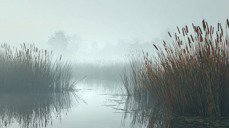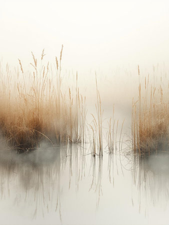 Gentle reeds sway in the cool mist of an early morning near a tranquil lake in late autumn