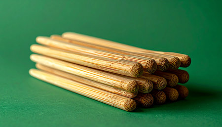 A neat pile of natural wooden dowels rests against a rich green background. The simple, clean arrangement evokes a sense of order, potential, and natural materials, perfect for concepts of building, crafting, or foundational elements.