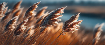 Tall golden grass sways gently in the breeze by a calm water body during the golden hour of late afternoon creating a serene atmosphere.