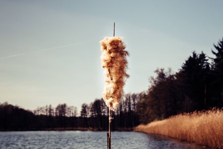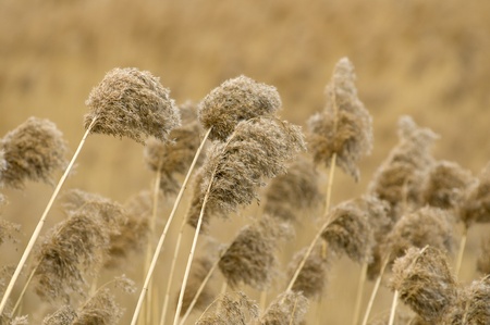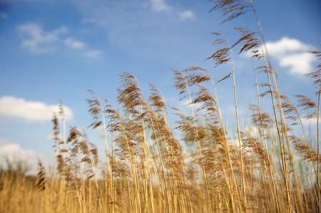 Golden sunlit reed waving by the wind