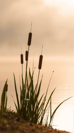 Gentle reeds sway in the cool mist of an early morning near a tranquil lake in late autumn