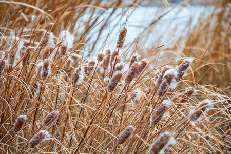 Dry reeds in morning hours. Close up. Outdoors. Sunrise