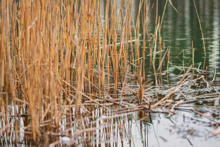 dry stalks of reeds at the pond sway in the wind on an autumn day, Ukraine
