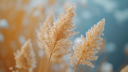 Golden reeds sway gracefully in the breeze, set against a tranquil blurred backdrop of water and nature, evoking a sense of peace and natural beauty.