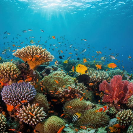 Vibrant coral reef teeming with colorful marine life in crystal-clear waters