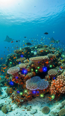 An enchanting underwater scene featuring a rich variety of corals and colorful tropical fish, illuminating the beauty of marine ecosystems and inviting exploration of ocean depths.
