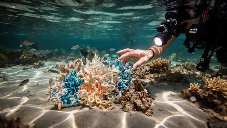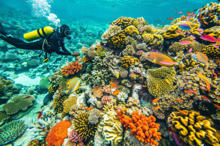 An AI generated illustration of a diver exploring the vivid coral reef teeming with marine life in crystal waters