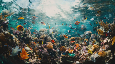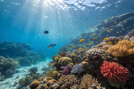 Vibrant coral reef ecosystem teeming with diverse array of colorful marine life and fish swimming in the clear blue waters of the tropical ocean