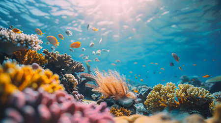 Experience the serene beauty of an underwater coral reef, showcasing vibrant marine life illuminated by captivating sunlight rays. Discover nature