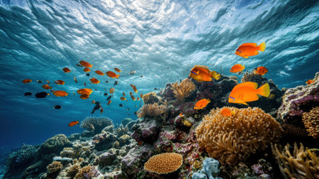 An enchanting underwater scene showcasing vibrant tropical fish and colorful coral reefs in crystal clear water. Ideal for nature lovers and aquatic enthusiasts.