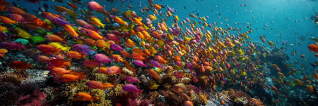 Vibrant coral reef panorama showcasing colorful marine life under clear waters