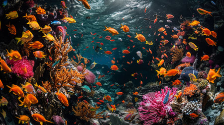 Explore the colorful and vibrant marine life in the tropical underwater ecosystem of the vibrant coral reef, a stunning habitat for a wide variety of fish and aquatic creatures