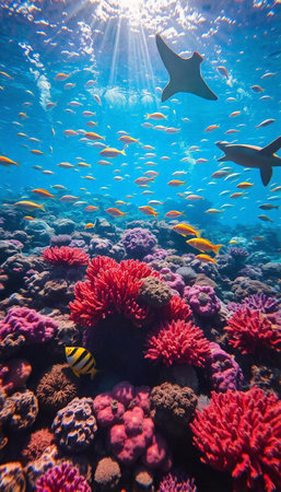 Vibrant coral reef teeming with marine life and colorful corals