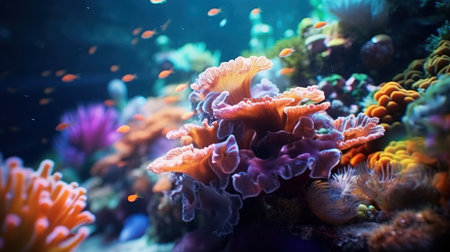 Exotic oceanic colorful fluorescent coral reef with fishes on blue background. Aquarium hobby. Generative AI.
