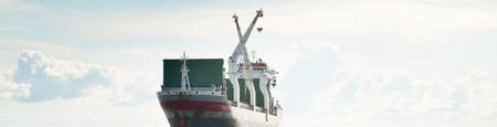 Large modern general cargo crane ship (142 meters length). Freight transportation, nautical vessel, logistics, global communications, economy, business, industry. Panoramic view