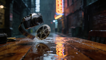 Vintage camera and film reel float above a wet wooden table in a rainy urban alley with neon reflections and blurred background providing space for text and design elements