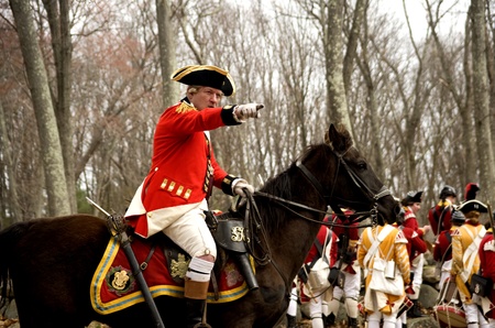 Concord, USA - April 16, 2011: British soldiers fight the Minute Man on Battle Road in Concord, MA during the Commemorating the Patriot Day