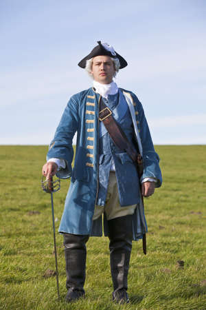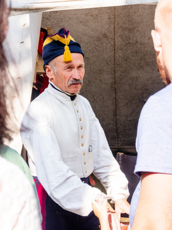 MOSCOW, RUSSIA - August 19, 2018. Man in historical costume at the festival Times and Epochs. Historical reconstruction of 19th century.