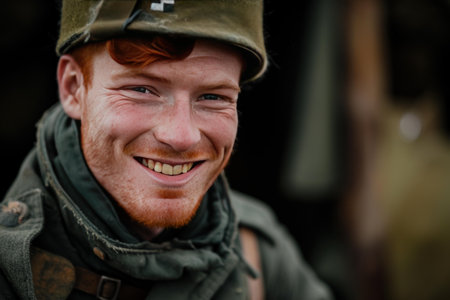 Close-up of a young soldier with a smile, wearing a retro army uniform and helmet
