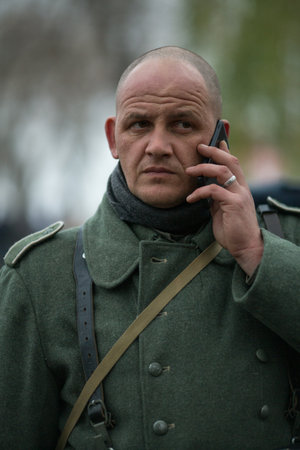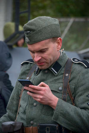 Lviv, Ukraine - October, 14, 2020: Military historical reconstruction is dedicated to the anniversary of the creation of the armed forces. The participant of the reconstruction uses cellular communication.