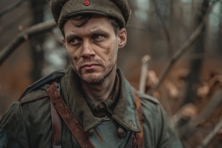 Poignant wartime portrait, sacrifice and bravery in a soldier's emotional photograph from the second great war, a powerful depiction of human toll and resilience amidst fight for liberty.