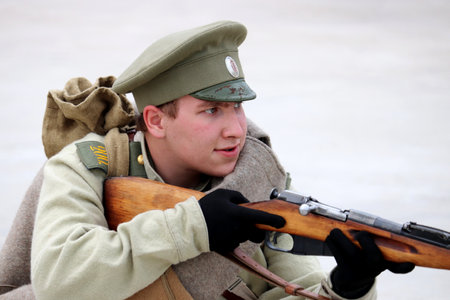 Moscow, Russia - September 2020: Soldier of the Russian Empire of early 20th century aiming a rifle during the city day of Moscow in Mitino park. Historical reconstruction of the World War I