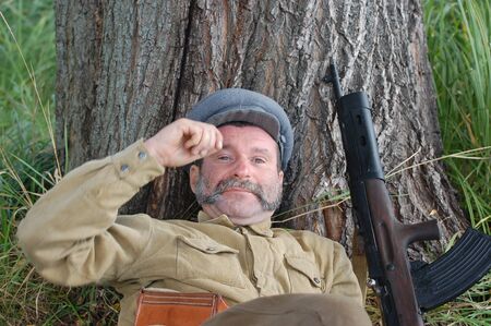Soldier of the USSR in a greatcoat in the field. Gomel, Belarus