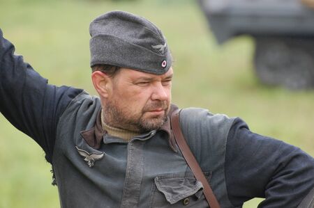 CHERNIGOW, UKRAINE - AUG 29: A member of Red Star military history club wears historical German uniform during historical reenactment of WWII, August 29, 2010 in Chernigow, Ukraine