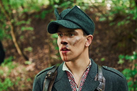 TERNOPIL, UKRAINE - June 2020 UPA Ukrainian Insurgent Army movie filming. Pictures of backstage. Young man with blood on face