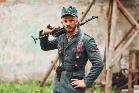 TERNOPIL, UKRAINE - June 2020 UPA Ukrainian Insurgent Army movie filming. Pictures of backstage. Young soldier with weapon near old building