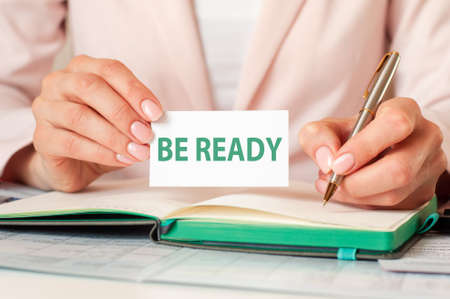 Woman writes in a notebook with a silver pen and hand hold card with text: BE READY. Pink background, front view. Business and education concept.