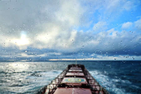 View of the ocean and sky through raindrops on the glass of a ship's porthole.