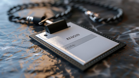 A blank name badge with a black lanyard rests on a crumpled silver background, ideal for events, conferences, or professional gatherings. Perfect for customization.