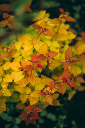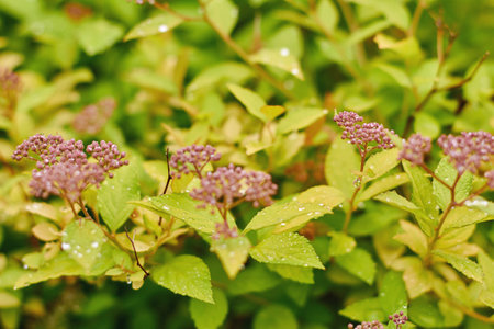 Japanese pink spirea close-up with raindrops on the leaves during flowering.