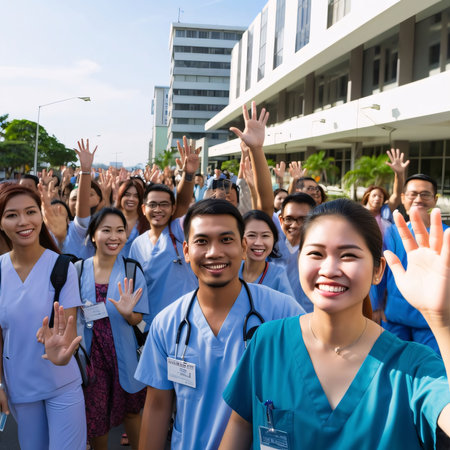 Hospital and doctors help: Unidentified Thai medical staff in uniform and face mask are raising their hands in the air to celebrate the end of the coronavirus.