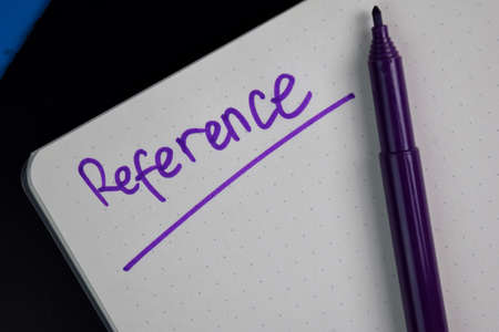 Top view of watch, earphones and notebook written with REFERENCE